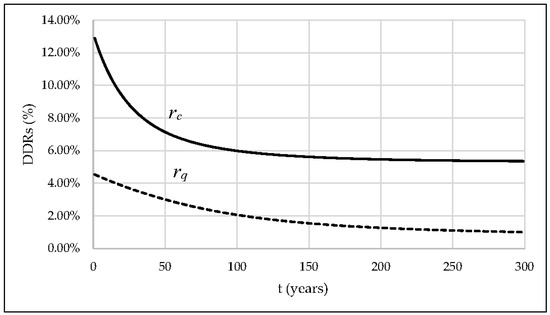 The next step is to move from the two uncertain and constant discount rates rc and rq, which coincide with the expected value of the probability distributions obtained, to certain but decreasing rates with a ‘certainty equivalent’. This is possible by using the expected net present value (ENPV) approach, according to which, assessing the ENPV with an uncertain but constant discount rate is correspondent to evaluating the NPV with a certain rate, but diminishing with a ‘certainty equivalent’ until it has the minimum value at time t = ∞ [33]. In order to move from the uncertain and constant discount rate to the certain but decreasing discount rate with a ‘certainty equivalent’, it is first necessary to assess the economic discount factors Ec(Pt) and environmental discount factors Eq(Pt), and then rct and rqt: