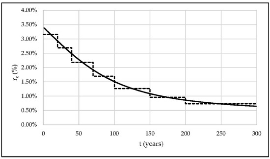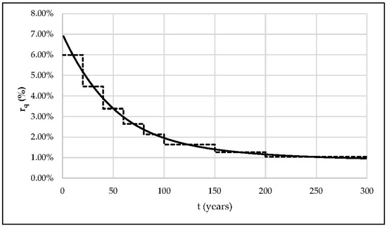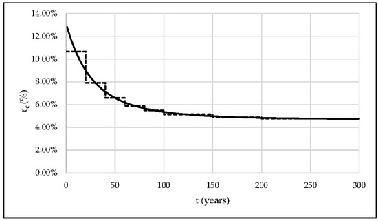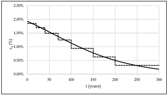 Figure 4 and Figure 5 explain the step functions (with solid lines) that approximate the functions (dashed lines) of the economic declining rate and the ecological declining rate for Italy. For practical purposes, it is useful to approximate the declining function to a step function. In other words, it may be permissible to use the same value of the discount rate for a period of thirty years in the analysis. In this time interval, the effect of present value contraction on cash flows can be considered acceptable [37,38,39]. Figure 6 and Figure 7 indicate the same step functions of rct and rqt for China.