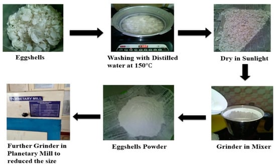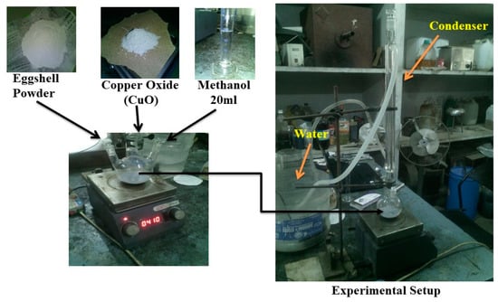 The waste eggshell was collected from the college canteen. The method of preparation of eggshell powder is shown in Figure 1. The collected eggshell was first washed in water and later boiled in a distilled water for 1 h to remove all the impurities [31]. It was dried in a sunlight then kept in an oven for overnight at a temperature of 110 °C. Initially, normal grinder was used to make eggshell powder; later, planetary ball mill machine was used to make fine calcium oxide (CaO) powder as shown in Figure 2. CaO powder was synthesized with copper oxide (CuO) to prepare composite methoxide powder as shown in Figure 2. The chemical reaction is represented in Equation (1) [32]. Both the catalyst was taken in weight basis (70/30 ratio), 70% CaO and 30 % CuO and dispersed rapidly into 20 mL of methanol (99% pure) in a 200 mL three-neck round glass bottle reactor (Figure 2) equipped with glass reflux condenser and magnetic stirrer with heater. The reaction was conducted at a temperature of 65 °C under atmospheric pressure with continuous stirring at 600 rpm for 10 h. After completion of the reaction, the gray color slurry formed and dried in oven at 110 °C for 12 h. Finally, dried composite powder was obtained, which was used as catalyst [32].