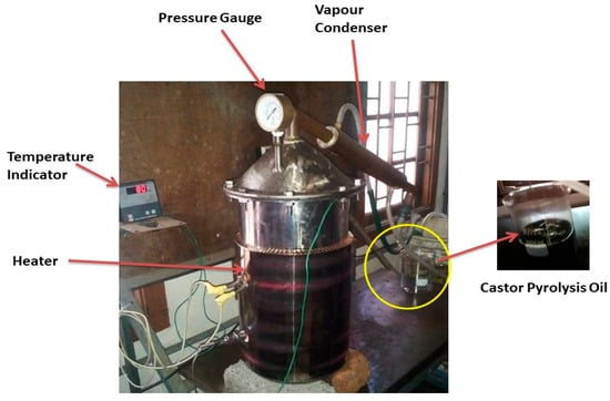 Thermal pyrolysis of castor oil was conducted at a temperature range 450–500 °C, residence time of 180 min at a rate of 20 °C/min as shown in Figure 3. The pyrolysis experiment was performed in a vertical semi-batch reactor (10 kg capacity) with electrical heating. The temperature was monitored through PID controller. The specification of the reactor is given in Table 4. A total of 8 kg of castor oil was fed and pyrolyzed for generating vapors, which was condensed by passing them through water cooled condenser. The condensed pyrolysis castor oil (PCO) was collected in a beaker. A small amount of ash was found as a by-product of pyrolysis after cooldown of the reactor.