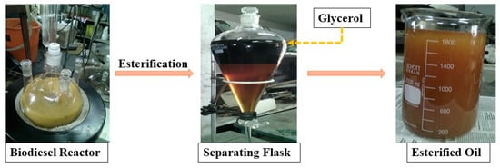 Biodiesel production was conducted in the biofuel laboratory using 5 L capacity biodiesel plant available in the laboratory. The various components of the test rig are shown in Figure 4. Prior to the esterification, acid value (AV) test was performed for castor oil [33]. According to Equation (2), AV of raw castor oil was measured to be 6.5 mgKOH/g which correspond to 3.25 of free fatty acids (FFA %) calculated from Equation (3) [33]. Since FFA value is greater than 2.5, which is not preferable for transesterification process. Therefore, esterification (Acid catalyst) reaction is required to minimize the AV [34]. A molar ratio (oil to methanol) of 1:6 was used with 2% (v/v) sulfuric acid (H2SO4) [34]. The reaction time of 3 h, temperature of 65 °C and a stirrer speed of 600 rpm was maintained. After the reaction, the resultant mixture was collected to separating flask and kept to 10 h for phase separation of glycerol and esterified oil (Figure 4). Later, esterified oil was collected in a beaker and placed in an oven at 110 °C for 2 h to remove the excess methanol and moisture. The FFA % was calculated and found to be 1.9% which is lower than 2.5. Therefore, a dried esterified castor oil was used for further transesterification process.