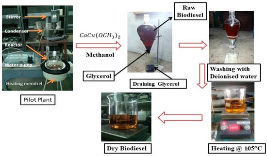 The transesterification of PCO was performed with CaCu(OCH3)2 catalyst to produce pyrolyzed castor oil biodiesel (PCOB) as shown in Figure 5. To find the optimized condition for modified catalyst [CaCu(OCH3)2], an experiment was performed in terms of oil-to-methanol ratio, catalyst concentration, reaction time, and temperature. The stirrer speed (600 rpm) was kept constant for all test runs. The production process is detailed in Section 2.4.2.