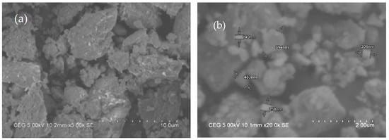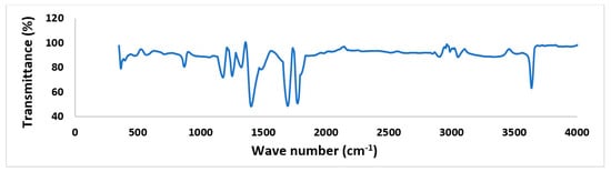 Figure 6 shows the morphology of the synthesis [CaCu(OCH3)2] catalyst. The particle was found to be stone-type and irregular shaped (Figure 6a). The particle size was not found less than 100 nm as shown Figure 6b; therefore, it cannot be considered as nanoparticle. The particle resembles a cluster due to heating at high temperature for long time. The FTIR spectrum of synthesis [CaCu(OCH3)2] catalyst is shown in Figure 7. It indicates that the important functional groups appeared in the -OH stretching vibration primary free alcohol (3640.972 cm−1), -C-H stretching alkane (3051–2905 cm−1), C=O stretching vibration and -C-C bond stretching (8630 cm−1). Furthermore, it was observed that the unusual peak appeared at 1256 cm−1.