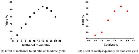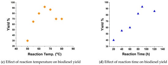 The biodiesel yields and fuel properties of the prepared castor biodiesel from the castor pyrolysis oil are dependent on the type and quantity of catalyst used, methanol-to-oil molar ratio, reaction temperature, reaction time and mixing speed. It is necessary to analyze the effect of a catalyst on yields such as methanol molar ratio, reaction temperature, reaction time and catalyst percentage [33,34]. It was observed that 16:1 methanol molar ratio gave the highest yields and beyond that point, the yields started to reduce (Figure 8a). The required catalyst percentage was measured on weight basis (wt./wt.%), and it was observed that 3% catalyst (i.e., 3% of oil weight) provides maximum yields (Figure 8b). The reaction temperature always plays an important role in the heterogeneous catalyst. It was observed that reaction temperature of 65 °C was optimum to obtain higher yields, beyond that, methanol starts to vaporize and lead to lower yield (Figure 8c). Reaction time is also an important parameter for heterogeneous catalyst to obtain a higher yield. Reaction time of 90 min was found to be best for maximum biodiesel yields (Figure 8d).