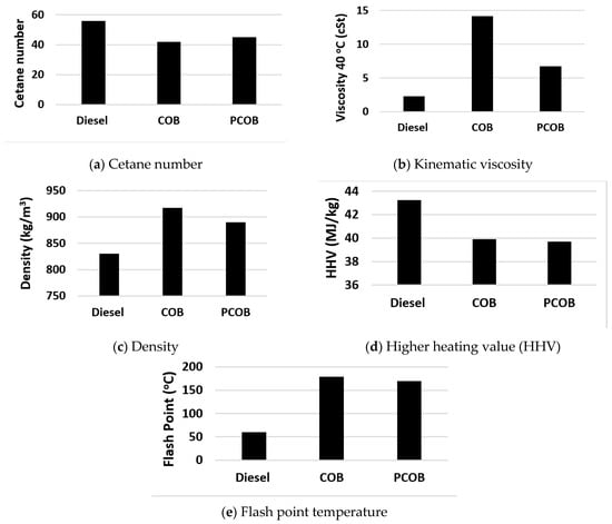 The density of biodiesel is higher than fossil diesel fuel. This means higher mass of biodiesel is injected per cycle when compared to fossil diesel operation. The fuel density affects the air–fuel ratio, ignition delay, in-cylinder temperature, and engine out emissions [24,37]. The density of the PCOB was measured at 890 kg/m3, which is 3% lower than that of COB (Figure 9c). The density of PCOB was also found within the biodiesel standards limits, but it is higher than petroleum standard limits as shown in Table 5.
