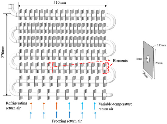 The evaporator studied in this research consists of 14 tubes spaced in 2 columns, as illustrated in Figure 1. The fins are separately mounted with free gaps between adjacent tube rows. The fin number generally increases from bottom to top tube rows (except for the top row) to mitigate the frost maldistribution caused by the leading-edge effect [20]. In this model, the evaporator is divided into elements based on the fin distribution. The internal element is composed of two adjacent fins and the flow channel between them, while the lateral element is only a half of the internal one.