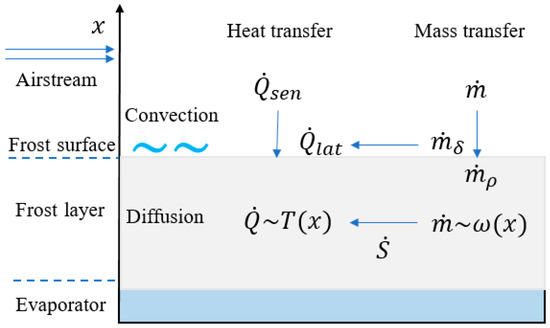 The frosting process during humid air flowing over the cold surface is illustrated in Figure 2 with heat and mass transfer indicated. The heat transfer includes two parts: the sensible part and the latent part . The former accounts for the airflow being cooled by the cold evaporator or frost, while the latter comes from the desublimation of water vapor (into frost) contained in the humid air. Moreover, the mass transfer also plays two roles in frost growth. One part of the water vapor enters the inside of the frost layer and increases its density and the other part desublimates on the surface of the frost layer to increase its height.