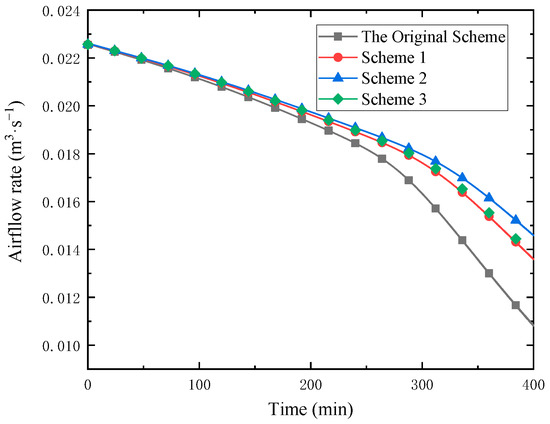 Airflow rate for three schemes during frosting 400 min duration.