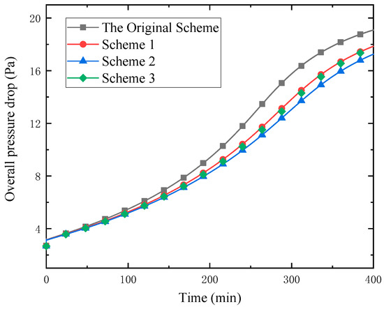 The difference in the air flowrate among four schemes is induced by that in the overall pressure drop of the evaporator. The increase of pressure drop will decrease fan air flowrate according to the flow characteristics of the fan. When the pressure drop reaches 16 Pa, the fan stall occurs. As shown in Figure 8, the pressure drop of the optimized Scheme 2 is smallest among the three cases. At 400 min, the air pressure drop of the optimized Scheme 2 is 17.3 Pa, which is 9.6% lower than 19.1 Pa of the original scheme.