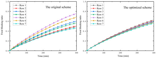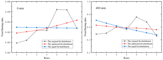 From the above discussion in Section 3.1, it can be concluded that the optimization method works by reaching a good match between the frost and fin distribution. Frost blockage ratio can be an index to evaluate the matching degree. Figure 14 comparatively illustrates the frost blockage ratio of three fin distribution at 0 min and 400 min.