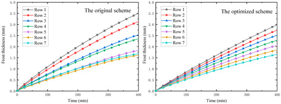 The blockage ratio between adjacent fins is influenced mainly by two factors: fin spacing and frost thickness. The frost layer thickness of each row for the original scheme and the optimized scheme is compared in Figure 11. Results show that the frost layer thickness of both two schemes decreases along the direction of air flow due to the leading-edge effect [18]. Hence, in order to prevent frost layer from completely blocking the airflow passage of upstream rows, the fin density is generally thinner in the upstream rows but denser in the downstream rows on the evaporator. In the original scheme, however, fins in the 5th and 6th tube rows seem to be over-dense and cause local blockage there. In the optimized scheme, by contrast, the fin spacing and frost thickness reached the condition that makes the blockage ratio of all tube rows similar.