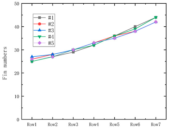 To match the reduced frost formation in the vertical direction due to the leading-edge effect [20], the fin density is generally thinner in the upstream rows but denser downstream on the evaporator (except Row 7, considering the refrigerant migration during the starting stage of the compressor). However, too many fins in downstream tube rows can also cause severe frost blockage there, as shown in Figure 5.
