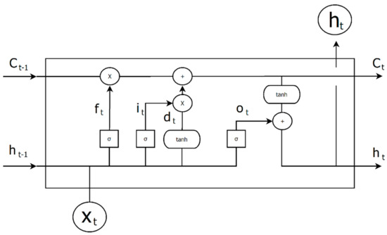 An overview of the LSTM cell is presented in Figure 1 where each symbol corresponds to the respective symbols explained in Formulae (1)–(6) and the multiplication as well as the addition blocks connect the terms of each formula in this diagram. LSTM networks are trained with back propagation through time and gradient descent [33].