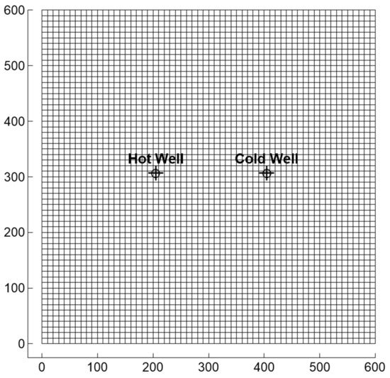 The Meletta Beds’ reservoir was conceptualized as a 600 × 600 × 10 m (x,y,z) box divided into a 60 × 60 matrix of 10 × 10 × 10 m grid cells (Figure 4). The hot and cold wells were placed at the coordinates 205 m (x) and 305 m (y), and 405 m (x) and 305 m (y), respectively, in the center of the cells, rather than at a node. The parameters and boundary conditions of the models are detailed in Table 1, Table 2, Table 3.