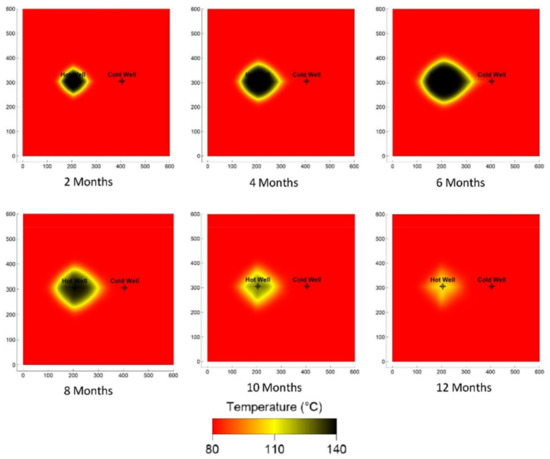 Figure 6 shows the evolution of the thermal plume over the initial thermal storage and production seasons, i.e., months 0–12. The initial reservoir temperature is 80 °C. Upon injection of 140 °C pre-heated fluid during the thermal storage period (months 0–6), a thermal plume appears around the injection well, i.e., the hot well. This plume is sub-circular, with a tail towards the production well (cold well) appearing in month 4. The plume reaches a maximum radius of about 100 m after month 6, with the tail extending another ~30 m in the direction of the production well. After month 6, the cycle is reversed. The hot well becomes the producer, and the cold well becomes the injector. The plume is reproduced, leaving only a diamond-shaped area of residual heat in the reservoir within a ~50 m radius of the hot well. The temperature in this region increased from the ambient 80 to about 100 °C.