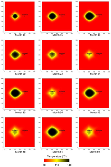 Figure 7 shows the evolution of the plume for the remainder of the simulation, i.e., through month 60. The cycle described in the previous paragraph repeats on a yearly basis, with a thermal plume out to about 100 m from the hot well forming during the thermal storage period, and the plume being retracted again through the hot well during the heating season. The size of the main plume does not change significantly during the storage period, although the tail towards the cold well does become thicker and marginally longer. The diamond of residual heat around the hot well at the end of the cycle increases on a yearly basis. The interior of the warmed area is heated to about 120 °C out to a distance approaching 75 m from the wellbore. This area is surrounded by a 10–20 m boundary area of temperatures above ~100 °C.