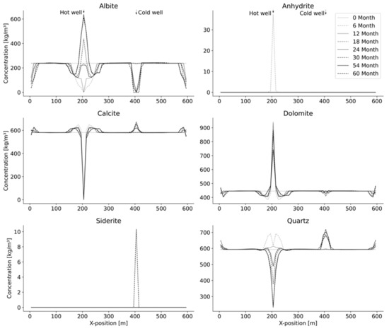 During the initial injection at the hot well, annite (initial concentration of 130 kg/m3) reduces to zero between x = 180 and 250 m and increases to ~135 kg/m3 between x = 250 and 320 m. After month 12, the annite concentration between the wells in the section x = 250–350 m gradually increases to 140 kg/m3. During the first injection at the cold well, the concentration of annite spikes a little bit in the space x = 380–420 m before decreasing to 0 kg/m3 within the wellbore over the course of the simulation. This depletion extends to a radius of ~20 m around the wellbore.