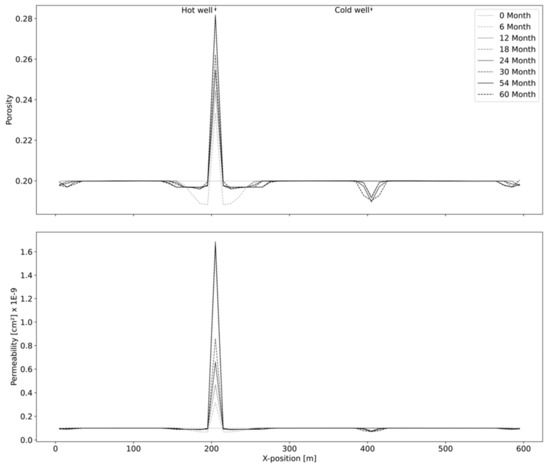 The reservoir’s changes in permeability mirror the change in porosity. The initial reservoir permeability is 0.15 × 10−9 cm2. The permeability spikes at the hot well, where it attains a maximum value of ~1.6 × 10−9 cm2 after 60 months. This spike tapers off within ~10 m of the hot well. At the cold well, the permeability decreases only slightly within ~10 m of the wellbore. Beyond ~10 m from either wellbore, no change in the reservoir permeability is observed throughout the simulation.