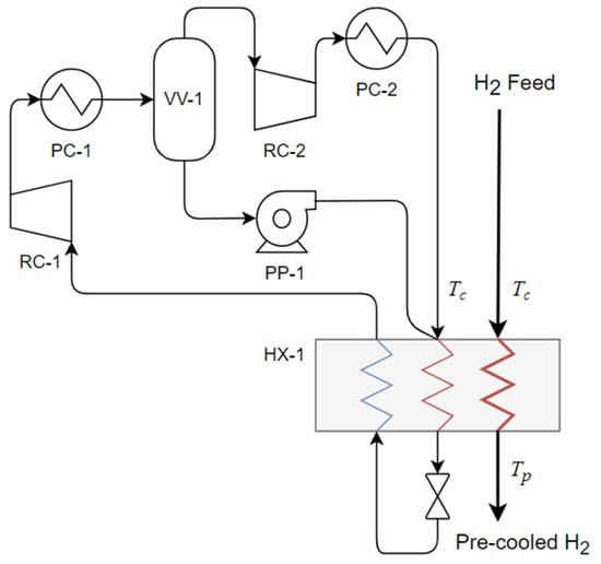 Figure 1 illustrates the process flow scheme used for the MR pre-cooling process, which is based on the flow scheme used in the reference study of Skaugen et al. [17]. The main equipment items shown in Figure 1 are a compressor (comprising RC-1 and RC-2), two process coolers (PC-1 and PC-2), a MR separator (VV-1), a pump (PP-1), and the main heat exchanger (HX-1). The MR compressor comprises two stages (RC-1 and 2), both with after-cooling (PC-1 and 2) to . Any liquids condensed liquids after the first stage are separated in VV-1. Liquids separated in this way are pumped (PP-1) to the compressor discharge pressure—bypassing the second stage of compression (RC-2)—and mixed with the vapor stream entering the main heat exchanger (HX-1). The main heat exchanger is modelled as a multi-stream type heat exchanger with two hot streams: H2 and high-pressure MR, and one cold stream: low-pressure MR. The low-pressure MR stream exiting the main heat exchanger returns to the MR compressor. Hydrogen leaving HX-1 is cooled to .