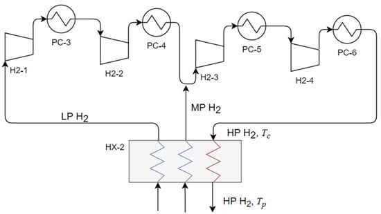 Figure 2 provides a sketch of the cycle compressor (comprising H2-1 to 4) for the cryogenic-cooling step which forms the basis of the present study. The stream LP H2 represents the low-pressure hydrogen stream returning from the liquefaction process. This stream is compressed in two compressor stages (H2-1 and H2-2) before blending with medium-pressure hydrogen. The combined stream is then compressed in two further compressor stages (H2-3 and H2-4) before being passed-back to a multi-stream heat exchanger (HX-2), which cools the HP stream down to . The compressor inter-stage pressures are calculated assuming equal stage pressure ratios.
