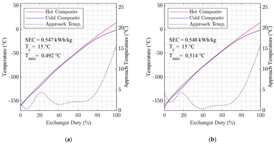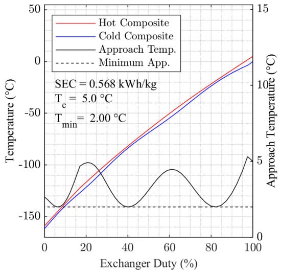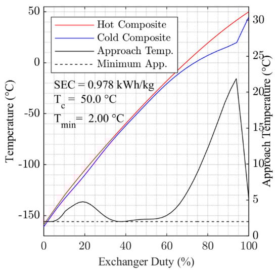 Figure 6 and Figure 7 present the hot and cold composite cooling curves for the overall minimum SEC solutions found for = 5 °C and = 50 °C. Generally, the results in Figure 6 and Figure 7 show that the optimization algorithm has found a good fit for the cooling curves, with the 2 °C pinch temperature approached in multiple locations within HX-1 in both cases. The cooling curves for each of the temperature points studied between = 5 °C and = 50 °C are presented in Figure A2, Figure A3, Figure A4, Figure A5, Figure A6, Figure A7, Figure A8 and Figure A9, which are contained in the Appendix A.