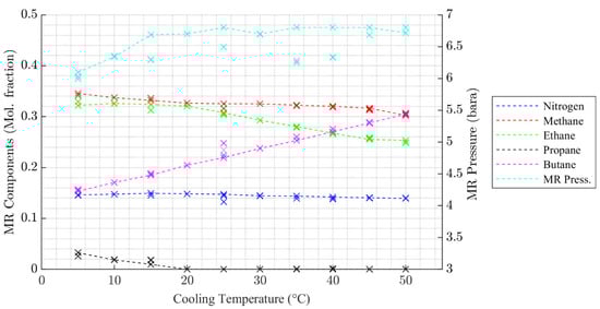 The implication of the results presented in Figure 9 is the same as discussed earlier: that design changes in the MR process could help to improve performance for the cases where the cooling temperature is higher than 25 °C. Both the addition of heavier components to the MR mixture could provide a more optimized design or the division of the MR loop into additional pressure levels. Both of these design alternatives could form the basis of further study work.