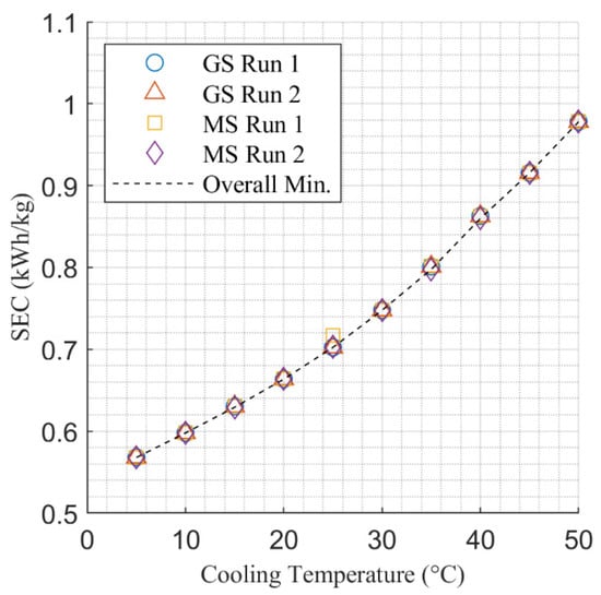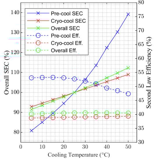 Figure 8 presents the SEC for the pre-cooling step, the cryogenic-cooling step, and the overall process. Figure 9 presents the same data in terms of the % change relative to the 25 °C case. Moreover, presented in Figure 9 are the corresponding second law efficiencies expressed as a percentage.