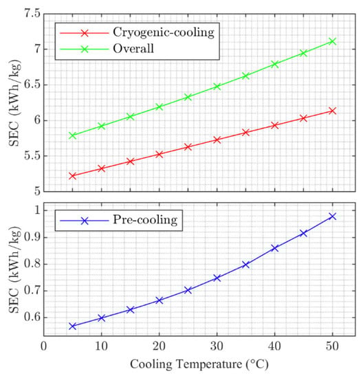 Variation in SEC with cooling temperature for the pre-cooling, cryogenic-cooling and overall cooling processes.