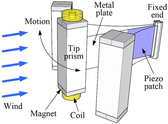 Wind is a widespread kinetic energy readily available in nature. However, small generators that have been scaled down from proven large wind turbines have poor performance due to aerodynamic problems, such as high drag at low Reynolds numbers. Therefore, successful miniature wind energy harvesters use fluid-induced vibrations such from galloping [,], flutter [,] vortex-induced vibration [,], and wake galloping [].