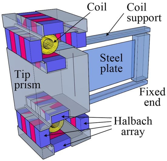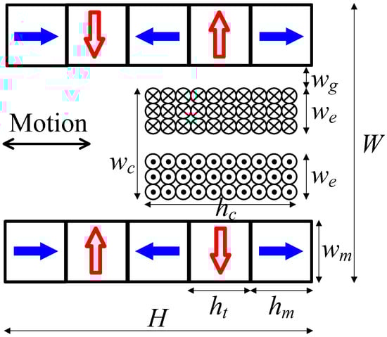 As shown in Figure 3, two electric generators were placed at the top and bottom of the tip prism. Each generator consisted of a linear Halbach array and a pick-up coil, as shown in Figure 2 and Figure 4. The relative size and position of the coil and magnets affected the performance of the generator. Figure 4 shows the main parameters for optimization: the sizes of the main magnet and the transit magnet, and the width and height of the coil.