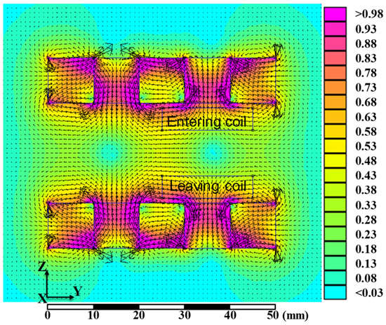 Each magnet in the linear Halbach arrays consisted of rare-earth neodymium, iron, and boron (NdFeB). The dimensions of each magnet were initially set as 10 mm × 10 mm, and the width of the gap for the free movement of the magnet and the coil was set to be 1 mm. For relative comparison, the sizes of the magnets and coils were normalized by dividing the reference dimensions. Figure 5 shows the results of magnetic field analysis around the Halbach arrays.
