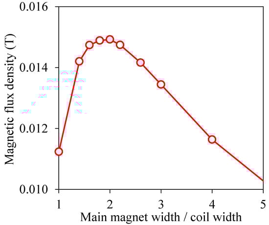 Figure 6 shows the change of magnetic flux density that is normal to the coil according to the ratio of the main magnet width to the coil width. As the width ratio increases, the magnetic flux density also increases and then decreases. The magnetic flux density is at its maximum when the width of the main magnet is twice the width of the coil.