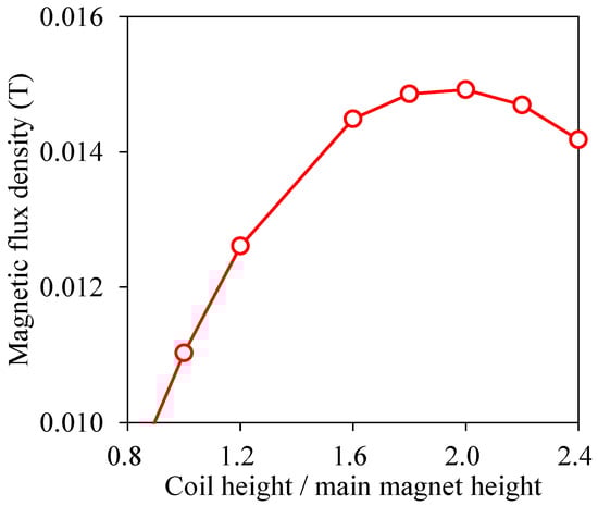 Figure 7 shows the change of magnetic flux density normal to the coil according to the ratio of the coil height to the main magnet height. It is assumed that the height of the main magnet and the transit magnet is the same. As the height ratio increases, the magnetic flux density also increases and then decreases slightly. When the coil height is twice the height of the main magnet, the magnetic flux density is at its maximum.