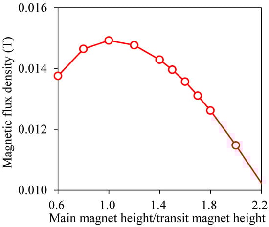Figure 8 shows the change of magnetic flux density as a function of the ratio of the main magnet height to the transit magnet height. The magnetic flux density of the coil is maximized when the heights of the main and transit magnets are equal.