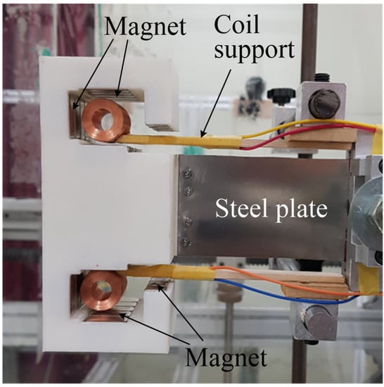 The optimal magnet and coil sizes were determined from the parametric study. In practical terms, the size of the magnets was selected according to commercial availability, even though it was slightly different from optimal. The dimensions of each magnet in the Halbach arrays were 10 mm (wide) × 10 mm (high) × 20 mm (long). Each Halbach array was made up of five identical neodymium magnets (NdFeB) of N35 grade, and the resulting size was 10 mm (wide) × 50 mm (high) × 20 mm (long). The parameters of the single coil are detailed in Table 1. The gap between the magnet and the coil was 2 mm.