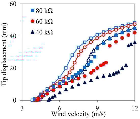 Variation of the tip displacements with wind velocity for different external load resistances (solid symbols: measured; lines with empty symbols: simulated).