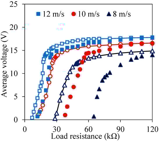 Variation of the average (RMS) voltage with the external load resistance for different wind velocities (solid symbols: measured; lines with empty symbols: simulated).