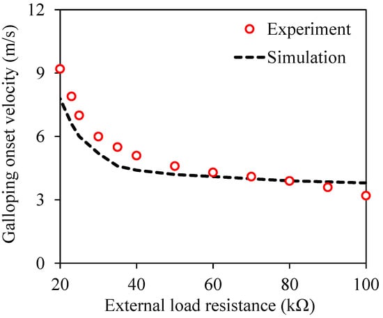Figure 14 shows the strong coupling between the galloping onset velocity and the external load resistance as a result of higher electric damping. The results revealed that one specific load resistance should not be applied to the entire wind speeds; rather, it should be changed according to the wind speed in order to produce the maximum power.