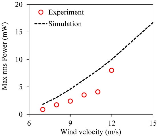 Figure 12 and Figure 13 show the measured and simulated average voltage and power versus external load resistances at three different wind velocities. When the load resistance gradually increased, the average voltage dramatically increased and then converged to a certain value, whereas the average power initially increased until its maximum value and then decreased. The external load resistances at which the voltage converged were equal to those for the maximum powers. The average power was very sensitive to external load resistance. The optimum load resistance for obtaining the maximum power was not constant—it varied with the wind speed.