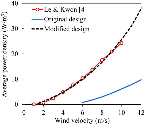 Figure 17 compares the performance of the Le and Kwon [] and the harvester of the original design using the Halbach array. The performance of the original design is lower than that of the previous one. The main reason for the low performance of the original design is the heavy mass of the tip prism. The tip mass of the original design was 641 g, but the mass of the previous one was 60 g, a significant difference. Embedded Halbach magnets in the tip prism significantly increased the mass. As the mass of the original design increased, the galloping wind speed increased and the amplitude decreased, reducing power production.
