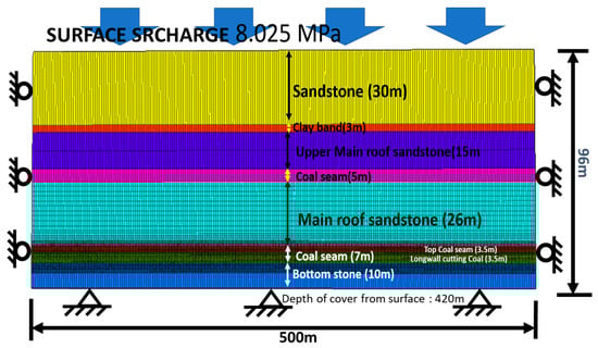 A seam of 7 m thickness is considered. The bottom section of 3.5 m coal is extracted by the shearer, and the remaining 3.5 m thick top section of coal is to be recovered as top coal by caving from the rear AFC as soon as the supports are advanced. The distance per cut is considered as 1 m. The length of the longwall panel was 500 m (co-ordinate axis +x in the model) with overlying strata of up to 96 m (Y-axis), i.e., with different layers as presented in Figure 1. The boundary conditions are assigned in the following manner: both the side displacements of the model are fixed along with the X and Y directions. The bottom displacements are fixed along the Z-direction. The implication of the fixation of the boundary is to allow the grids in the face to slide but not to move perpendicularly to the planes. The overburden effect is simulated by applying an equivalent compensated vertical stress of 3.12 MPa in the negative z-direction to represent the in situ stress. The strata layers are assigned physico-mechanical properties (Table 2). The truncated load was applied to the model to give a stress regime according to the depth. The major horizontal stresses were applied as per the following relationships as derived by the hydro-fracturing technique conducted at depths from 77 to 522 m by M/s Mesy India [26,34] for the Godavari Valley Coal Fields (GVCF):