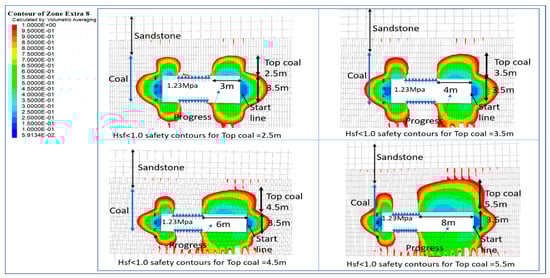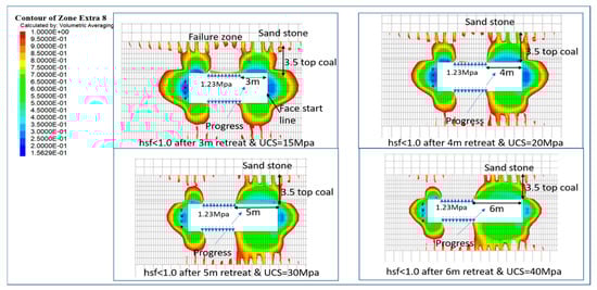 For the modeling, different top coal thickness values from 2.5, 3.5, 4.5, to 5.5 m were considered. An extraction height of 3.5 m was considered. RMR values, uniaxial compressive strength, and depths were taken at 40 MPa and 400 m, respectively. By varying the top coal thickness, the failure contours were derived by numerical modeling. The maximum FTCD was obtained with 5.5 m top coal thickness. For top coal thicknesses of 2.5, 3.5, 4.5, and 5.5 m, the FTCD obtained was 3, 4, 6, and 8 m, respectively, as shown in Figure 5.