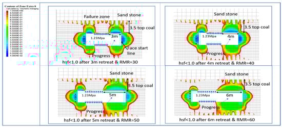 For the modeling, different RMR values, including 30, 40, 50, and 60, were considered. A 3.5 m height of extraction and 3.5 m thick top coal were considered. The uniaxial compressive strength value and depth were taken at 20 MPa and 400 m, respectively. By varying the RMR of coal, the failure contours were derived by numerical modeling. The maximum FTCD was obtained when the RMR was 60. For RMR of 30, 40, 50, and 60; the FTCD obtained was 3, 4, 5, and 6 m, respectively, as shown in Figure 3.
