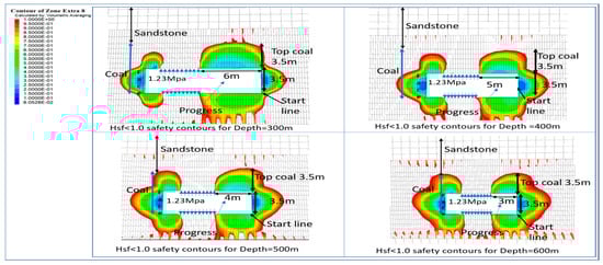 For the modeling, different depth values from 300, 400, 500, to 600 m were considered. A 3.5 m height of extraction and 3.5 m thick top coal were considered. RMR values and uniaxial compressive strength were taken at 40 and 20 MPa, respectively. By varying the depth, the failure contours were derived by numerical modeling. The maximum FTCD was obtained when the depth was 300 m. For depths of 300, 400, 500, and 600 m, the FTCD obtained was 6, 4, 4, and 3 m, respectively, as shown in Figure 4.