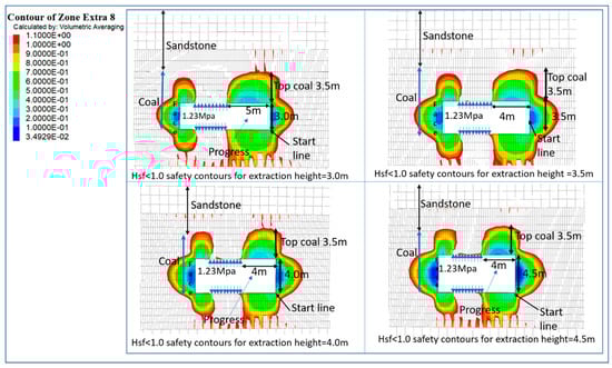 For the modeling, different extraction height values ranging from 3.0, 3.5, 4.0, to 4.5 m were considered. A top coal thickness of 3.5 m was considered. By varying the extraction height, the failure contours were derived by numerical modeling. The maximum FTCD was obtained when the extraction height was 4.5 m. For extraction heights of 3.0, 3.5, 4.0, and 4.5 m, the FTCD obtained was 5, 4, 4, and 4 m, respectively, as shown in Figure 6.