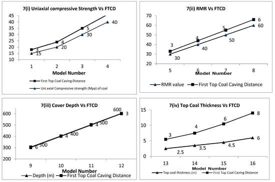 - The strength of the top coal (UCS) has a direct relation with TFCD with a good correlation (R2 = 0.97), as shown in Figure 7(i). As the strength of coal increases, difficulty in caving increases.
