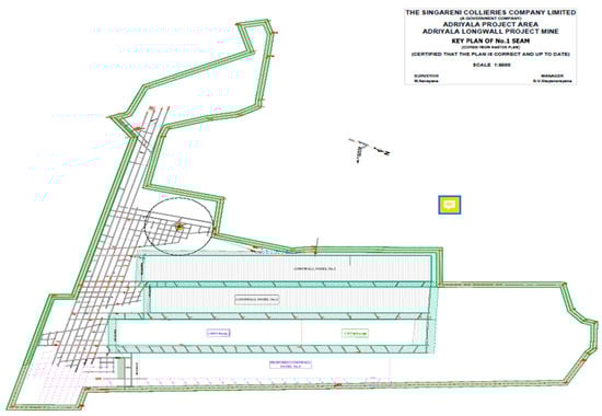The ALP mine is situated in the southeastern and southern parts of the Ramagundam coal belt of GVCF with four workable coal seams. Among the four workable coal seams (namely, No. 1, 2, 3, and 4 in descending order), the No. 1 seam (panels as shown in Figure 9) is being extracted by a single-pass longwall. All other underlying seams are virgin in this mine. The No. 1 seam is about a 7 m thick non-gassy seam, dipping at 1 in 5 to 1 in 7.8 (i.e., 6–12 degrees). The degree of the gassiness of the seam is Degree I (no methane emissions were traced). Though it is not an LTCC method, all the geotechnical parameters are suitable for adapting to the LTCC method, i.e., the extraction of the bottom section of 3.5 m by SPL. Due to the deployment of conventional longwall face equipment, the caved top coal is lost in the goaf as an immediate roof due to its poor quality, as stated by mine management. The mine is planned to work at a depth range of 294–644 m. It has 78.597 MT of extractable reserves. The envisaged life of the project is 35 years at a rated production of 2.8 million Tons per Annum. The annual production from the longwall panel is 1.75 million tons from shearer cutting (1.25 million tons from top coal with about 70% recovery). The average production from the longwall panel is 10,000–12,000 tonnes per day from shearer cutting, and if LTCC is implemented, an additional 7000 tons per day is expected. The face length is 250 m, the panel length is 2200, and the panel reserves are 3.36 million tons from front shearer cutting, which can be enhanced to 6 MT by adopting LTCC. The geotechnical parameters of the No. 1 seam and its overlying roof strata are presented in Table 5.