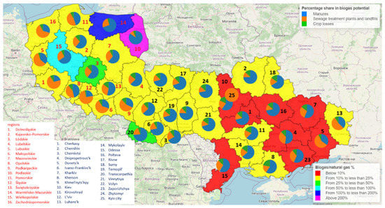 The importance of biogas is easier to understand when comparing the production potential of this fuel with the consumption of natural gas. This type of statement is presented graphically in Figure 2. The potential of biogas production as well as the share of individual “sources” in its building was calculated for each of the regions (NUTS 2). The analysis of the results showed that only in the case of two Polish regions, Podlaskie and Warmińsko–Mazurskie, the potential of biogas could fully cover the local demand for natural gas of over 261% and 105%, respectively. The potential of biogas would also play a very important role in satisfying the consumption of natural gas in the following regions: Wielkopolskie (51% of the demand), Łódzkie (44%), and Transcarpathia (26%). Moreover, in as many as 12 regions in Poland and 15 regions in Ukraine, the share of biogas in covering the demand for natural gas would exceed 10%.