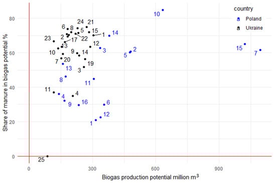 The length of the Polish–Ukrainian border is over 535 km and runs through the Podkarpackie (236 km) and Lubelskie (296 km) voivodships. An important advantage in favor of establishing cooperation is the fact that there are 10 border crossings that ensure high capacity for both people and goods. It should be remembered that in addition to access to substrates, efficient transport and a developed network of roads are very important for the efficient operation of any biogas plant. For this reason, the Transcarpathia region, due to the lack of a border crossing with the Podkarpacie region, was not taken into account. There are significant “developmental” differences between the Polish and Ukrainian regions under consideration, which can be transformed into attributes of a fruitful energy policy conducted, for example, within the framework of cross-border cooperation of functional areas. The greatest advantages of Polish regions include access to European funds related to the EU energy transformation and a well-developed agri-food economy, while the low cattle population remains a downside, mainly due to the structural changes that took place in agriculture after Poland joined the EU [26]. The undoubted advantage of the Ukrainian regions that there is a much greater (compared to Polish partners) potential for biogas production and the lack of strict regulations on agricultural production in contrast to UE members [42]. At this point, it is worth emphasizing that in the case of the Ukrainian agricultural economy, there is a noticeable increase in monoculturalism [43], a generally unfavorable trend for the development of agriculture, but allows for a significant increase in the biogas production potential in relation to Polish partners (Figure 6).