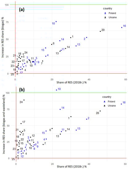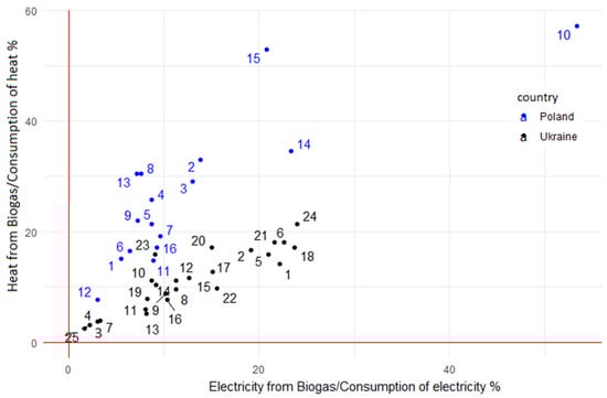 When analyzing the results shown in Figure 8, it is worth paying attention to the points located near the origin of the coordinate system because they indicate regions that would gain the most by activating the biogas potential. A very good example is the Chernihiv region, which could increase its share of renewable sources in energy consumption from the current 4.3% to over 88.8%, thus becoming a leader in Ukraine. A better result was obtained for the Podlasie region in Poland, where the share of renewable energy sources in energy consumption would increase from the current 22% to about 104% (Figure 8b). In terms of covering the demand for electricity, only one of the regions would achieve complete self-sufficiency (Podlasie region), but activating the potential of biogas would have a very positive impact on the energy security of many regions. In the case of eight of them, the share of renewable energy sources would cover over 50% of electricity consumption, while for another 14 regions, this share would range from 25% to 50% (Figure 8b). The results presented above confirm the validity of the third hypothesis.